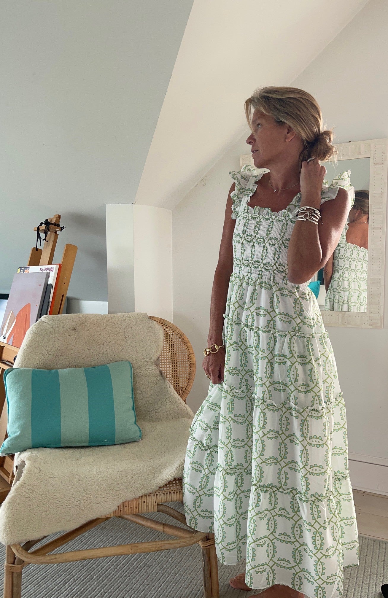 The Elizabeth Dress is made in beautiful an whimsical print with ruffle shoulder straps. Easy to get into and all day comfort with elastic smocking at bodice. Elegant at all angles, this A Line dress fits most sizes, including women who are pregnant. With a shirring ruffle detailed skirt that flows with the wind and a fit that you can wear from sun up until sun down, on the couch or out on the town. This forever favorite features a square neckline and two side pockets and is fully lined.