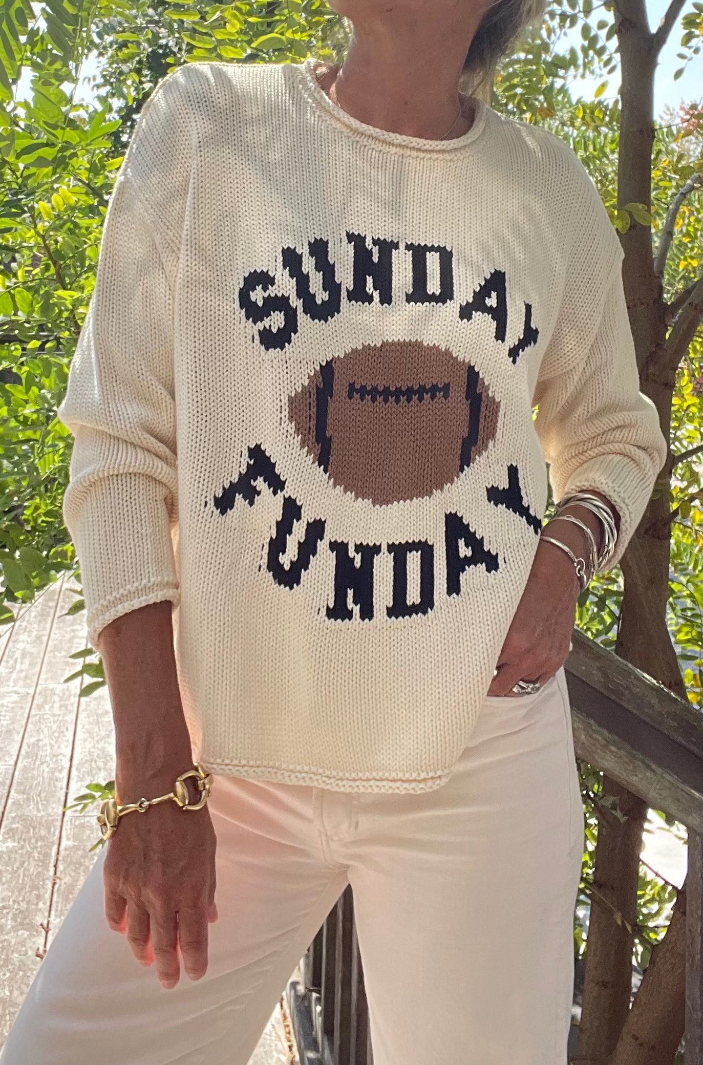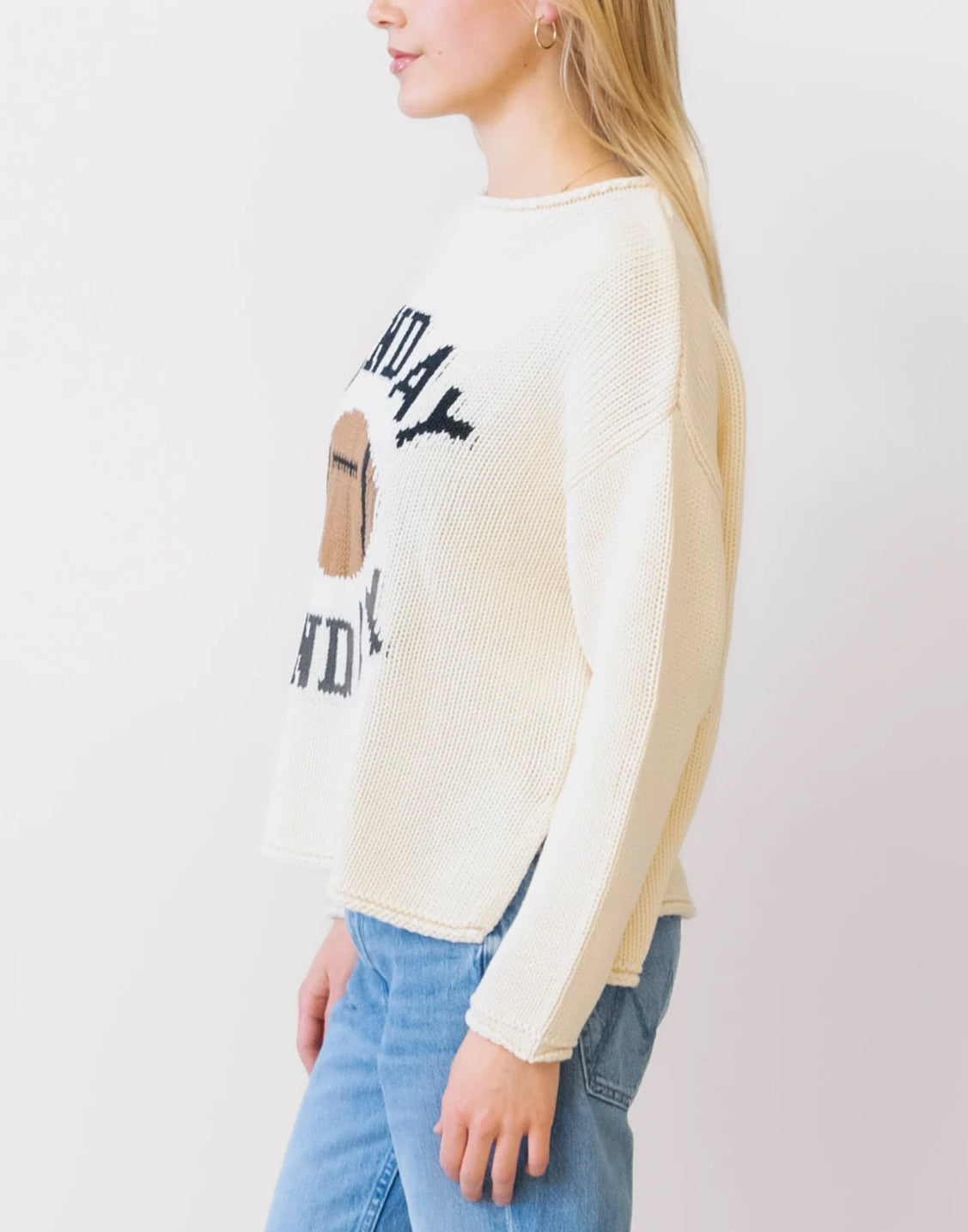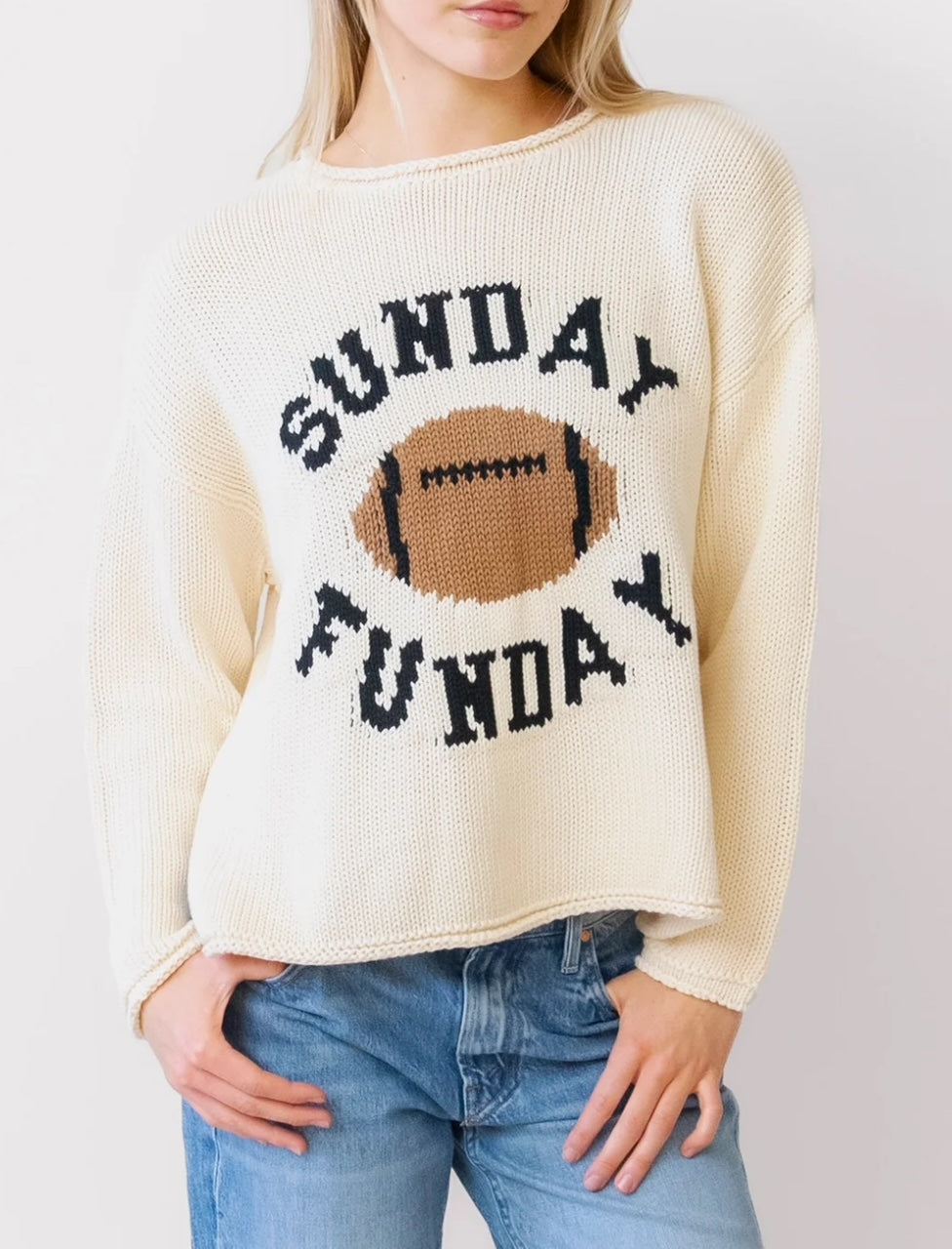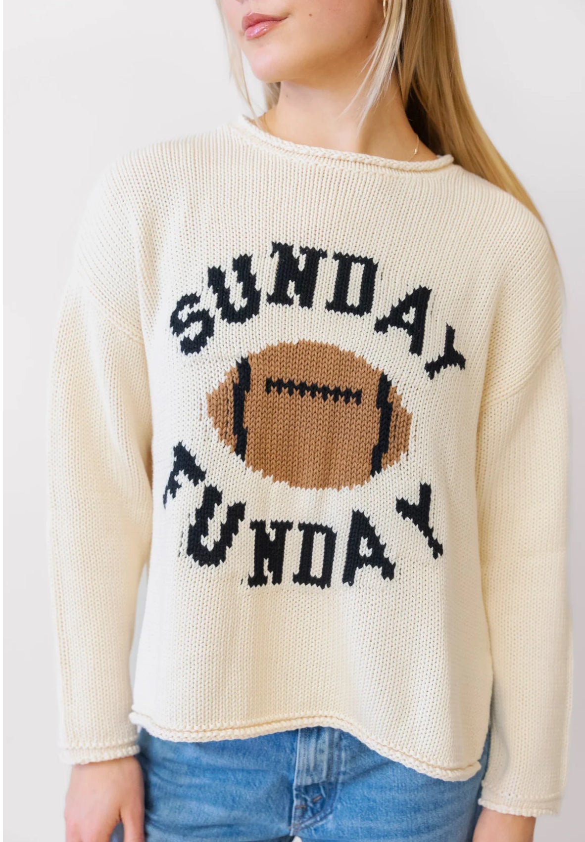 Our casual boxing cozy role neck sweater now available in Sunday Funday football - 🏈 Perfect for all your tailgating means.