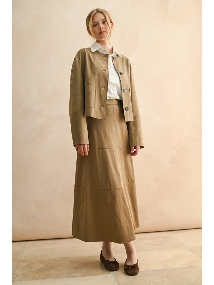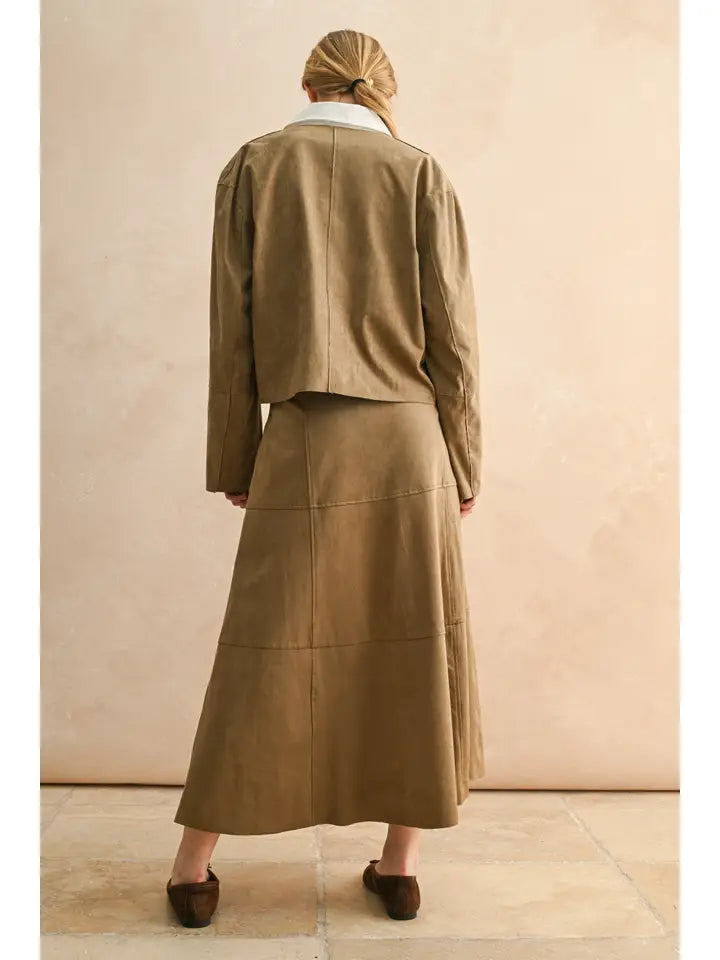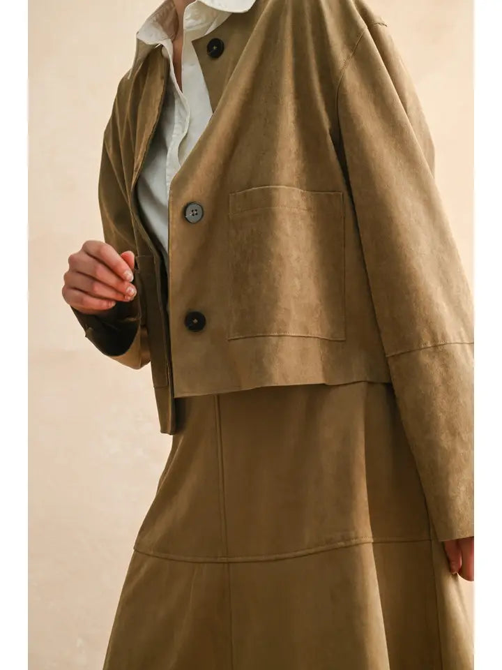 The Aspen Suede Jacket in rich mocha offers a luxurious suede feel that combines comfort with timeless style. Its soft texture enhances every outfit, while the warm mocha color adds a sophisticated touch, making it a perfect choice for both casual and dressier occasions. Loving this paired back to jeans!