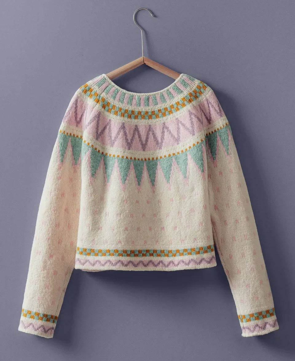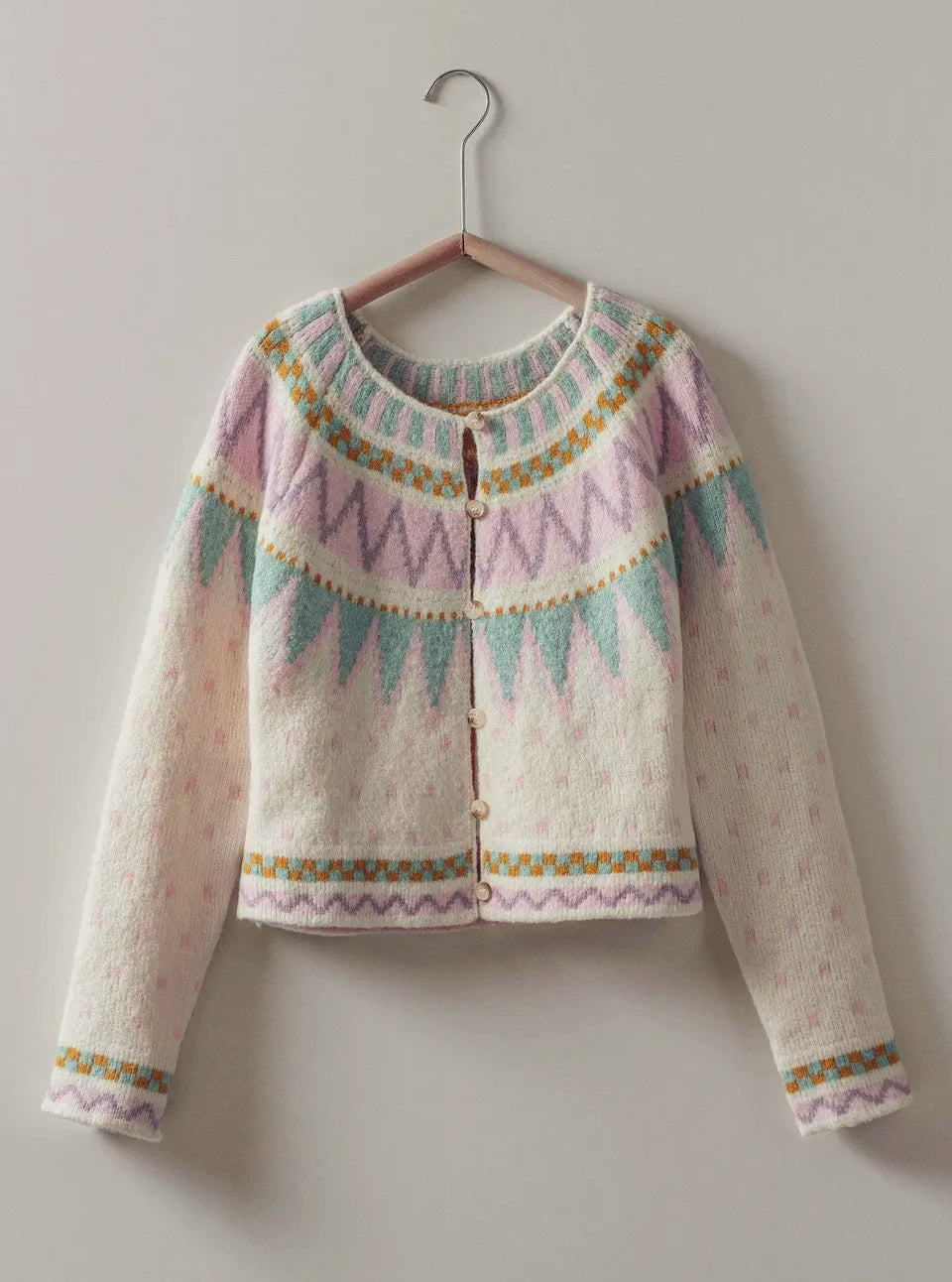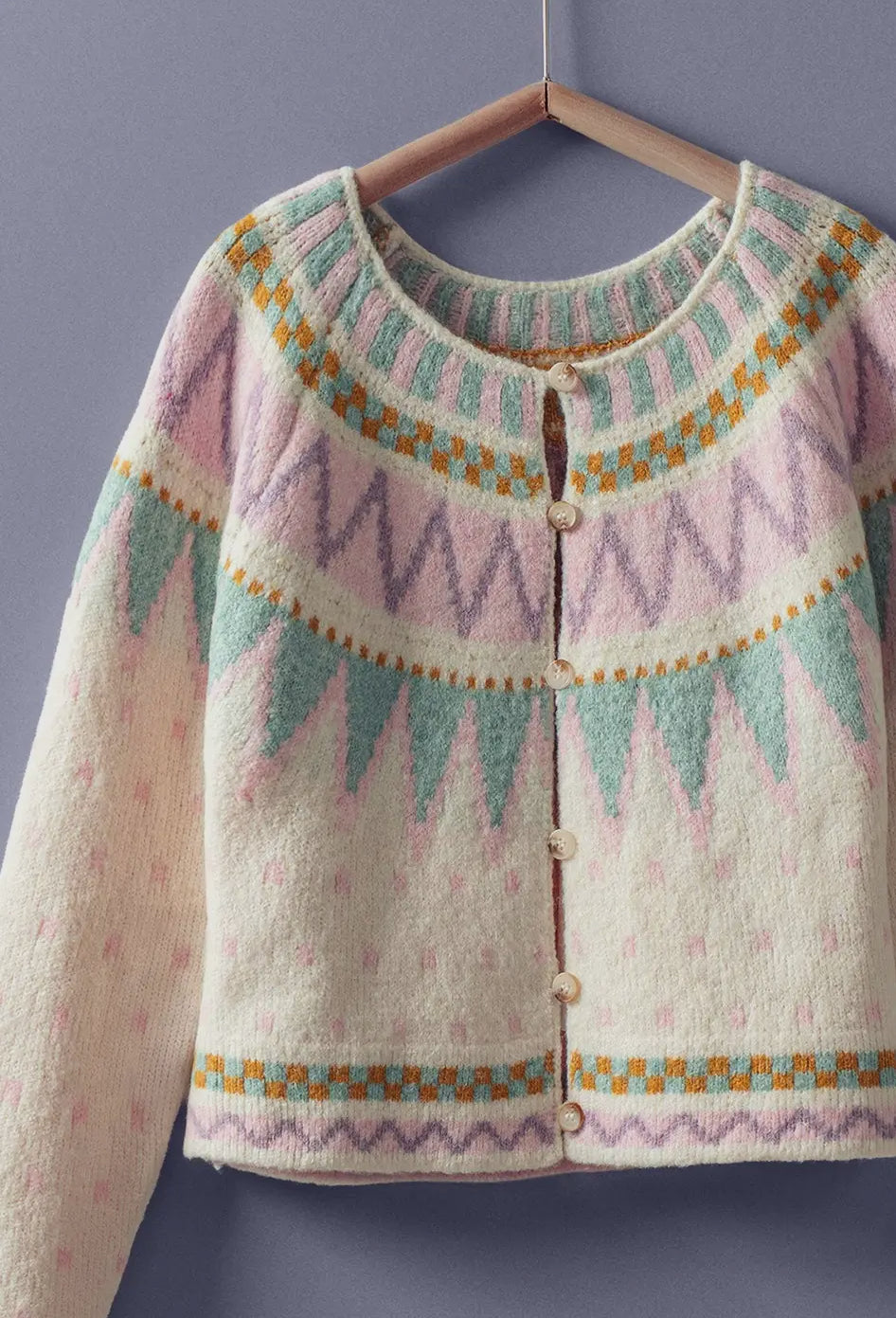 A modern spin on a traditional fair isle, this graphic circular pattern is knit to follow the natural shape of the neckline, creating a striking visual effect. Crafted from A soft plush knit this timeless style offers a cozy texture with a subtle pastel colorway. The cardigan is just a touch cropped—never oversized, just effortlessly easy.