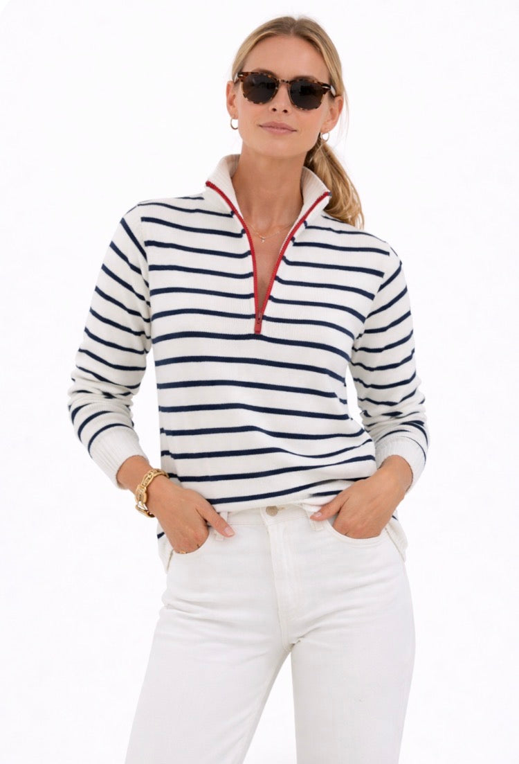 1/2 Zip Striped Cotton Sweater In White/Navy